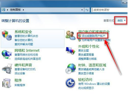 9、打开控制面板后,选类别,点击添加或删除用户账户。