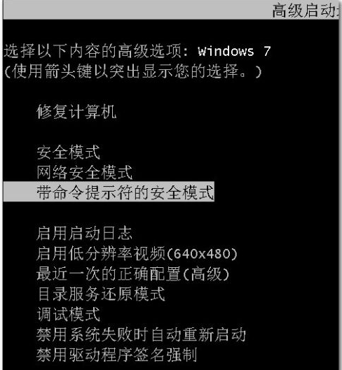 3、在Windows 7系统启动时按F8键会出现选项,选带命令提示符 安全模式。