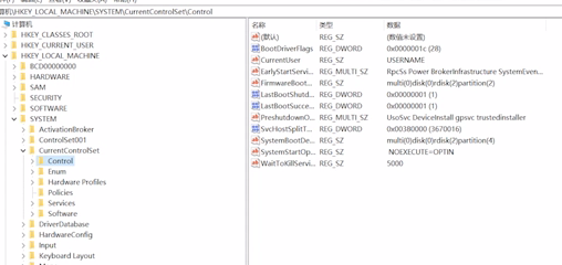 2、在打开的注册表中选择打开文件夹HKEY_LOCAL_MACHINE\SYSTEM\CurrentControlSet\Control,看右侧是否有“StorageDevicePolicies”