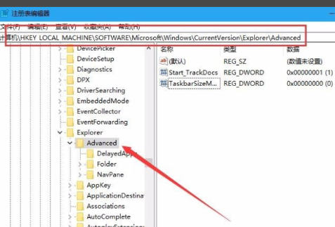 6、在打开的注册表编辑窗口中,我们把其定位到HKEY_LOCAL_MACHINE\SOFTWARE\Microsoft\Windows\CurrentVersion\Explorer\Advanced项