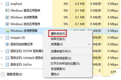 6、最后找到“Windows资源管理器”,右键重新启动即可。