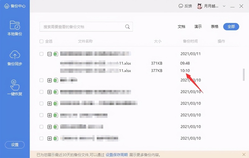 3.在备份中心界面我们可以看到文档自动备份的时间,我们只要双击打开后查看是不是所需内容点击保存即可;