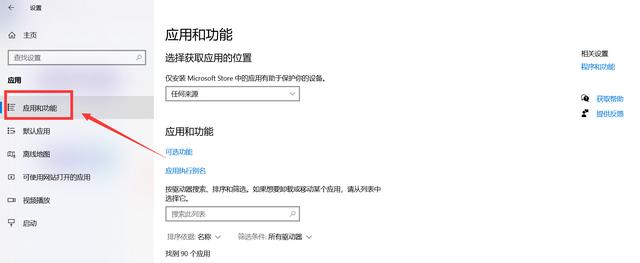 3.点击左侧应用和功能;