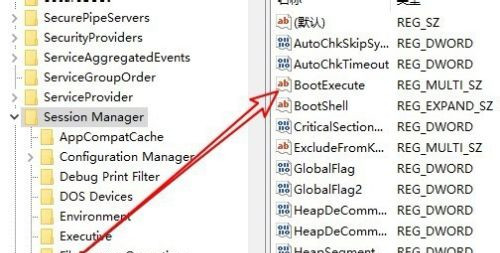 然后在右侧的窗口中找到BootExecute的注册表键值。