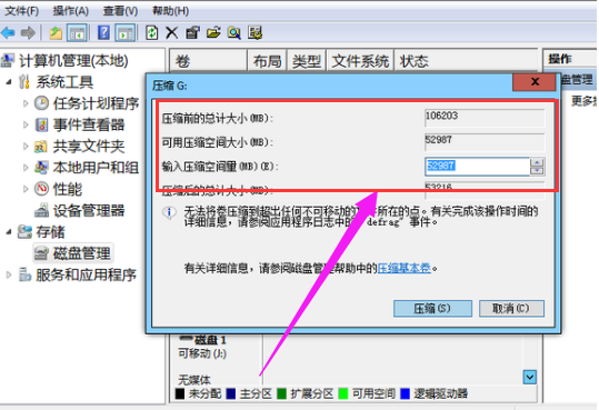 6.接着,在压缩的对话框中,在“输入压缩空间量”上面输入压缩的大小,然后再点击“压缩”即可完成操作;