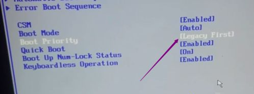 4、按→方向键移动到strat up,选择CSM回车,改成Enabled,Boot Priority改成Legacy First。