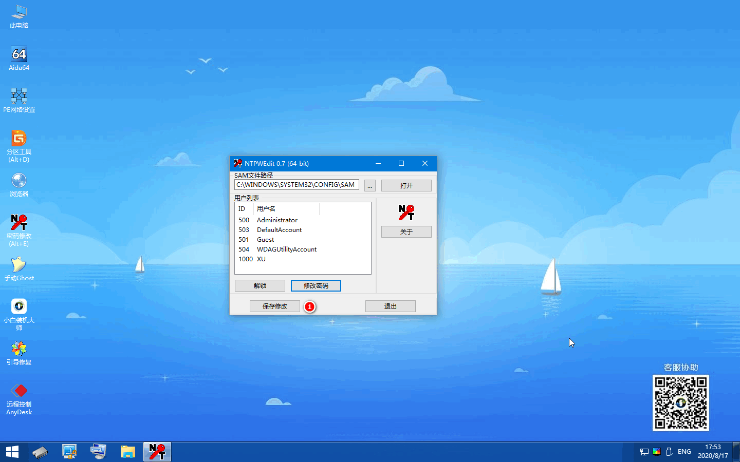 2、将制作好的u盘插入电脑,选择进入pe系统,点击密码修改。