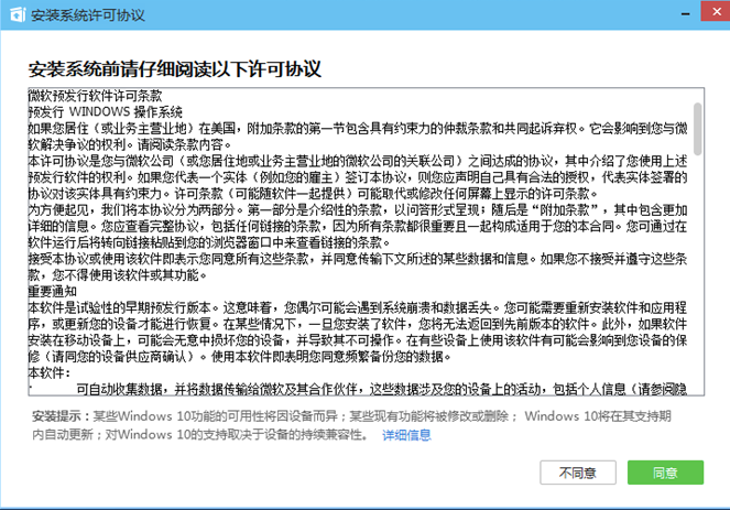 2、下载完成后,会默认弹出微软的用户协议,用户需要点击“同意”才能继续升级。