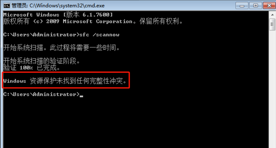 4. 如果无损坏的系统文件,电脑会提示“windows资源保护未找到任何完整性冲冲突”。