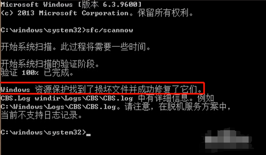 5. 反之电脑会对损坏的系统文件进行修复,最后弹出“windows资源保护找到了损坏文件并成功修复了它们”的提示信息。