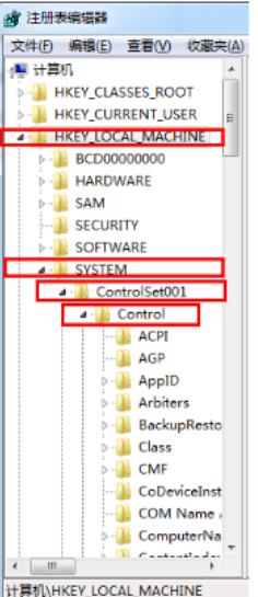 2,打开后依次选择HEKY_LOCAL_MACHINE——SYSTEM——ControlSet001——Control。