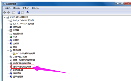 在“设备管理器”中,双击红框中选中的“通用串行总线控制器”按钮。