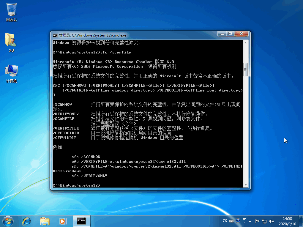 6、还以对系统的参考文件进行扫描和自动修复!只要在命令框输入 sfc /scanfile 回车即可!