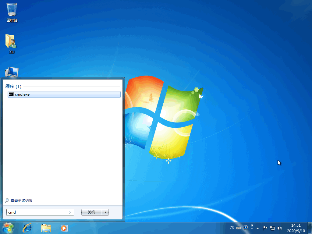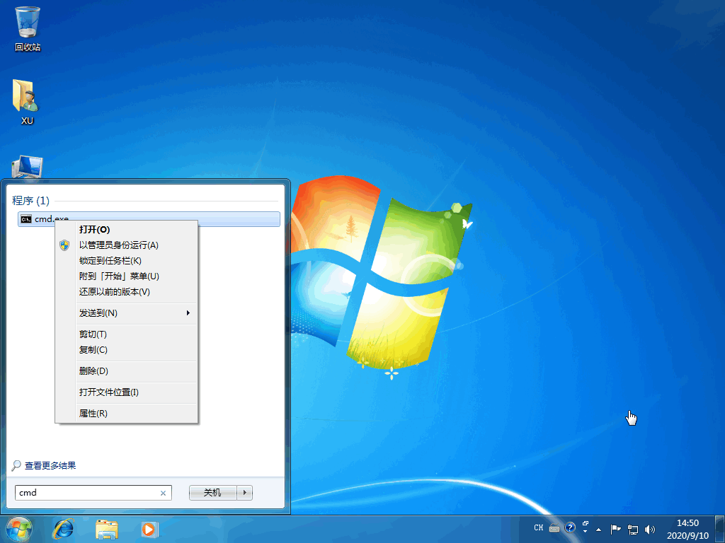 2、在搜索结果中找到CMD程序,右键点击程序,选择以管理员身份运行。