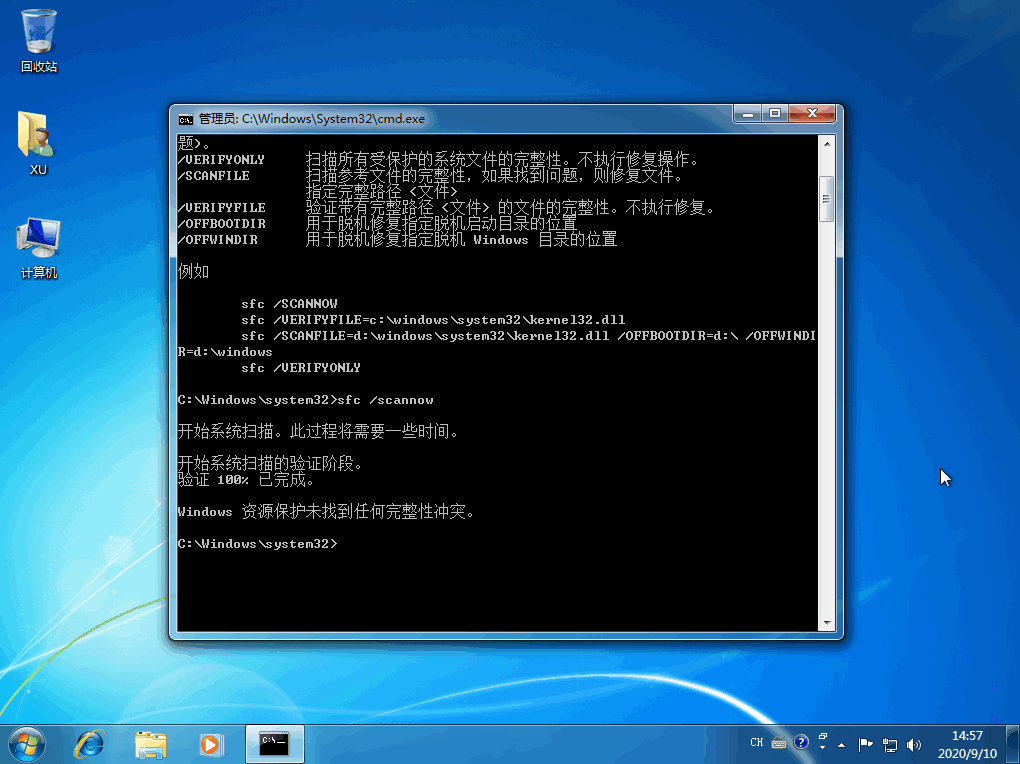 4、在提示符后面输入 sfc /scannow 回车,执行扫描系统文件并自动修复!等待修复完成即可!整个扫描过程持续时间大概10分钟。