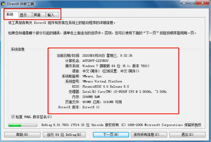 2.接着,就出现“DirectX诊断工具”,最后就可以看到主板型号啦。