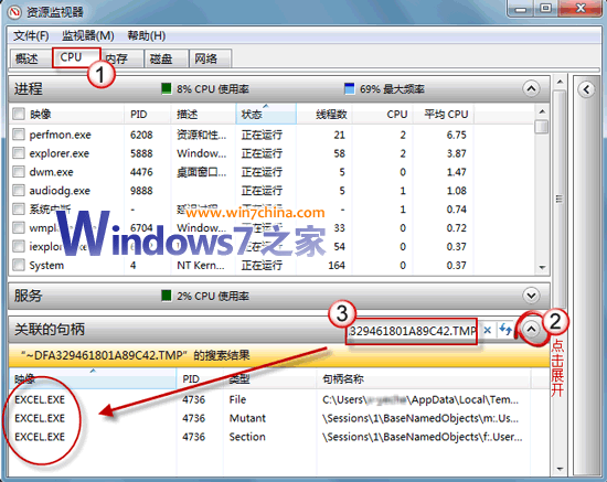 在“资源监视器”对话框中,切换到“CPU”选项卡。点击“关联的句柄”栏右侧的小箭头,将其展开。在搜索栏中输入文件名(若文件名较长,输入部分文件名即可),然后按一下回车键。现在,文件相关的所有进程都在“映像”栏中列出来了。