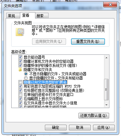 3、在打开Win7纯净版的文件夹选项后,使用鼠标切换到“查看”选项卡,勾选“始终显示图标,从不显示缩略图”和“不显示隐藏的文件、文件夹或驱动器”。并将“隐藏已知文件类型的扩展名”前面的复选框内的勾取消掉。最后再点击“确定”按钮,即可完成所有设置;