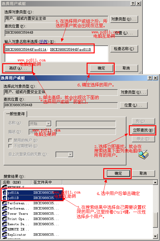 第4步:在弹出的“选择用户或组”窗口中,单击“高级”按扭,在弹出的“选择用户或组”窗口中单击“立即查找”按扭,在搜索结果中找到自己需要给局域网内其他电脑访问的用户,并确定,回到“选择用户或组”并再次确定。