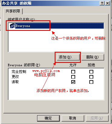 第3步:在打开的“共享文件夹的权限”窗口中,单击“添加”按扭。