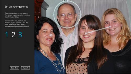 图片密码:解开电脑的密码锁不再需要输入冗长的密文,只需要在图片上执行三个操作就行了,无论是轻击某一点、连接一条线以及画上一个圈,都可以让您的开机变得更有fan。