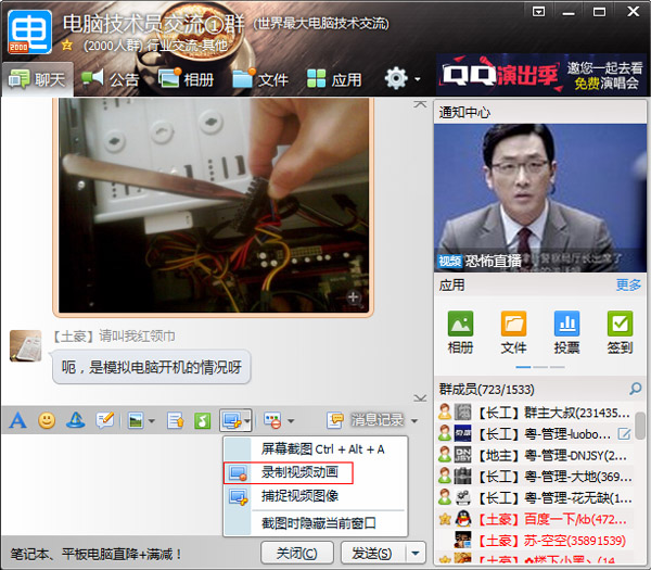 二、打开一个QQ聊天窗口,选择窗口下方的小剪刀图标,从弹出的菜单中选择录制视频动画。