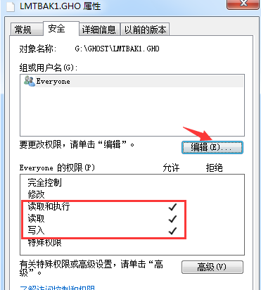 方法二:右键点击需要操作的文件,打开属性,转到安全选项卡,点击编辑,勾选权限中的完全控制保存即可。