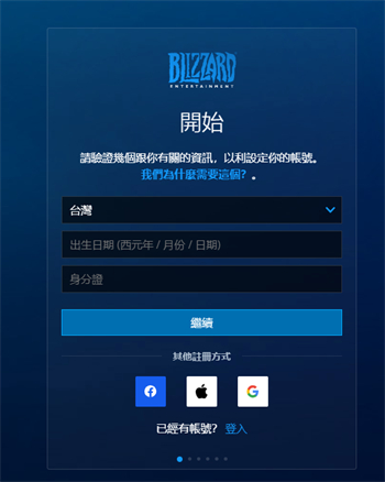 1、打开台服战网官网:建立 Battle.net 帳號,在打开的台服战网注册页面,我们需要输入您的出生年月日(满十八周岁),另外还需要填写身份证,这里的身份证是台湾地区的身份证,这里你可以百度搜索“台湾身份证”,找一个号码填写就行(如果是香港IP注册的话,填写你自己的身份证号码就行了)。填写完之后,点“继续”;如下图