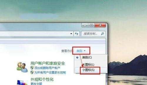 2、在控制面板右上角按图示方法设置成“小图标”。