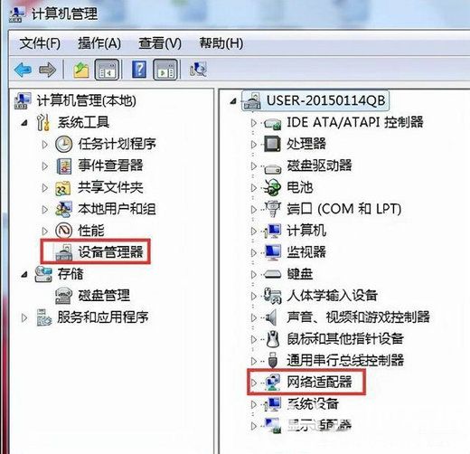 1、鼠标右键点击“计算机”,选择“设备管理器”。