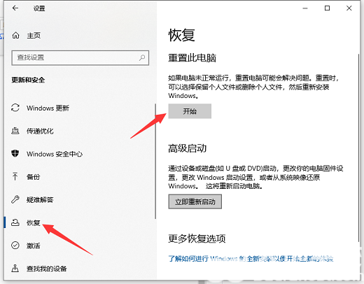 3、点击左侧的恢复栏,然后再选择重置此电脑,点击开始重置此电脑。(如果进不了系统,也可以尝试强制关机两次,第三次开机时会自动进入Windows RE修复环境,进入win10安全模式操作)