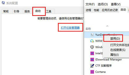 4、点击“启动”,点击“打开任务管理器”,点击启动项,单击禁用