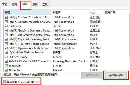 3、点击“服务”,单击“隐藏所有Microsoft”服务,单击全部禁用