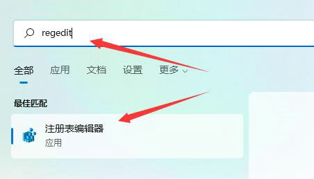 1、首先我们点击开始菜单,在上方搜索框中输入“regedit”,然后点击注册表编辑器打开。