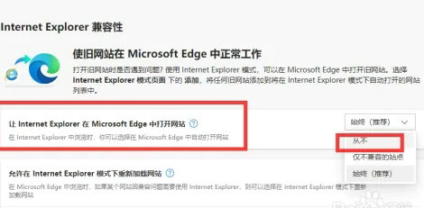 5、让 Internet Explorer 在 Microsoft Edge 中打开网站右侧如果选择的是“始终”,打开ie浏览器就会自动跳转成打开edge浏览器,改选成“永不”之后就可以正常打开ie浏览器了