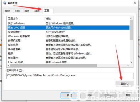 2、在系统配置工具,下面选择点击更改UAC设置然后再点击启动。