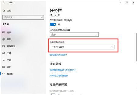 3、在设置中找到任务栏设置,将合并任务栏按钮改为任务栏已满时。