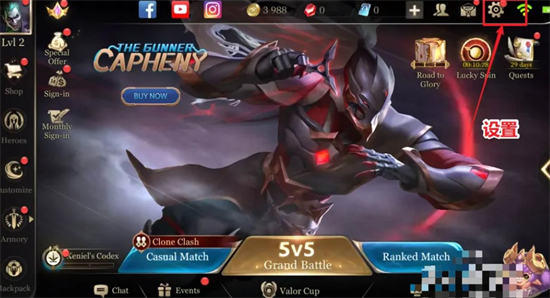 2.打开传说与对决后,进入游戏后,点开右上角的齿轮样设置。