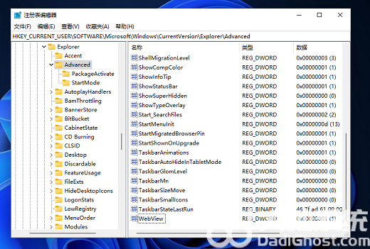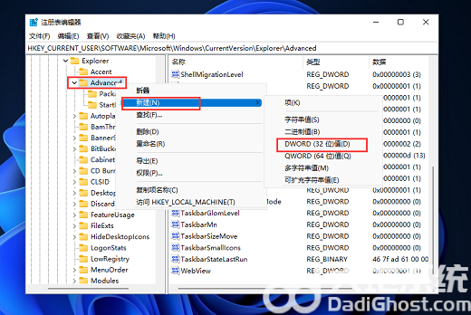 然后打开该路径HKEY_CURRENT_USERSOFTWAREMicrosoftWindowsCurrentVersionExplorerAdvanced
