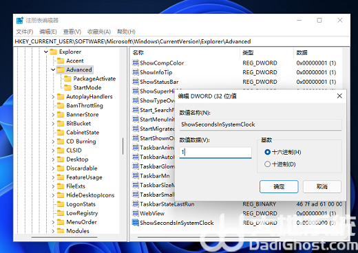 文件命名为ShowSecondsInSystemClock,双击打开将数值数据改为1,并点击确定,关闭注册表。