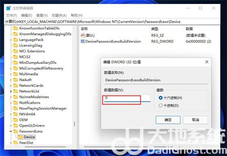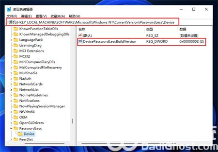 进入注册表后,找到对应文HKEY_LOCAL_MACHINE\SOFTWARE\Microsoft\Windows NT\CurrentVersion\PasswordLess\Device