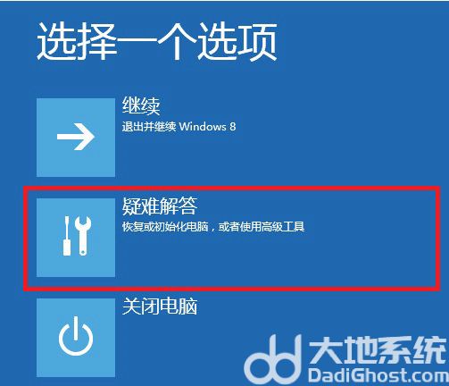 6、电脑重启后,在选择一个选项界面,点击疑难解答;