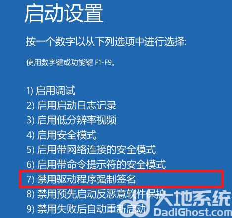 8、重启后在启动设置界面,点击“禁用驱动程序强制签名”。
