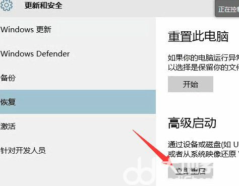 5、在更新和安全界面,点击恢复。然后在右侧选择菜单-- 高级启动---立即重启;