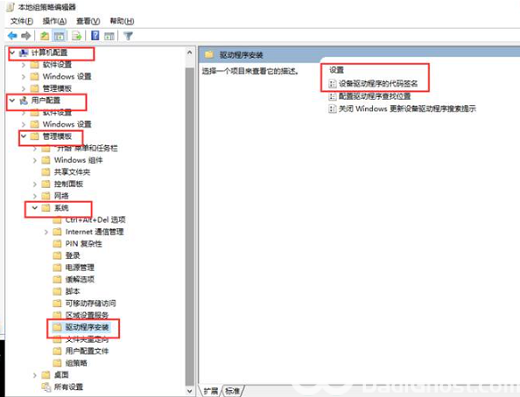 2、在打开的本地组策略编辑器窗口,找到:用户配置---管理模板---系统---驱动程序安装;