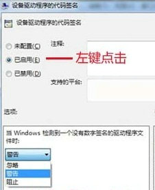 4、在打开的设备驱动的代码签名窗口,选择:已启用,在选项的下拉框中,有:警告、阻止、忽略供选择。