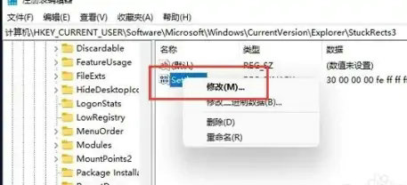 2、点击确定运行窗口,在注册表内找到:\HKEY_CURRENT_USER\Software\Microsoft\Windows\CurrentVersion\Explorer\StuckRects3。