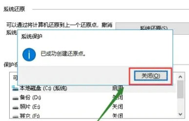 7、创建成功,点击关闭按钮,点击配置,可以设置还原点所耗用硬盘空间的大小即可