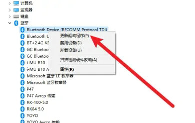 3、点击蓝牙的【更新驱动程序】选项完成修复