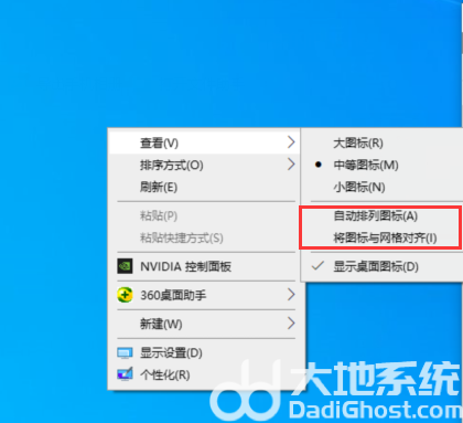 3.在查看目录下我们将自动排列图标跟将图标与网格对齐两个功能的勾选都去掉,使用鼠标点击桌面空白处,退出设置。